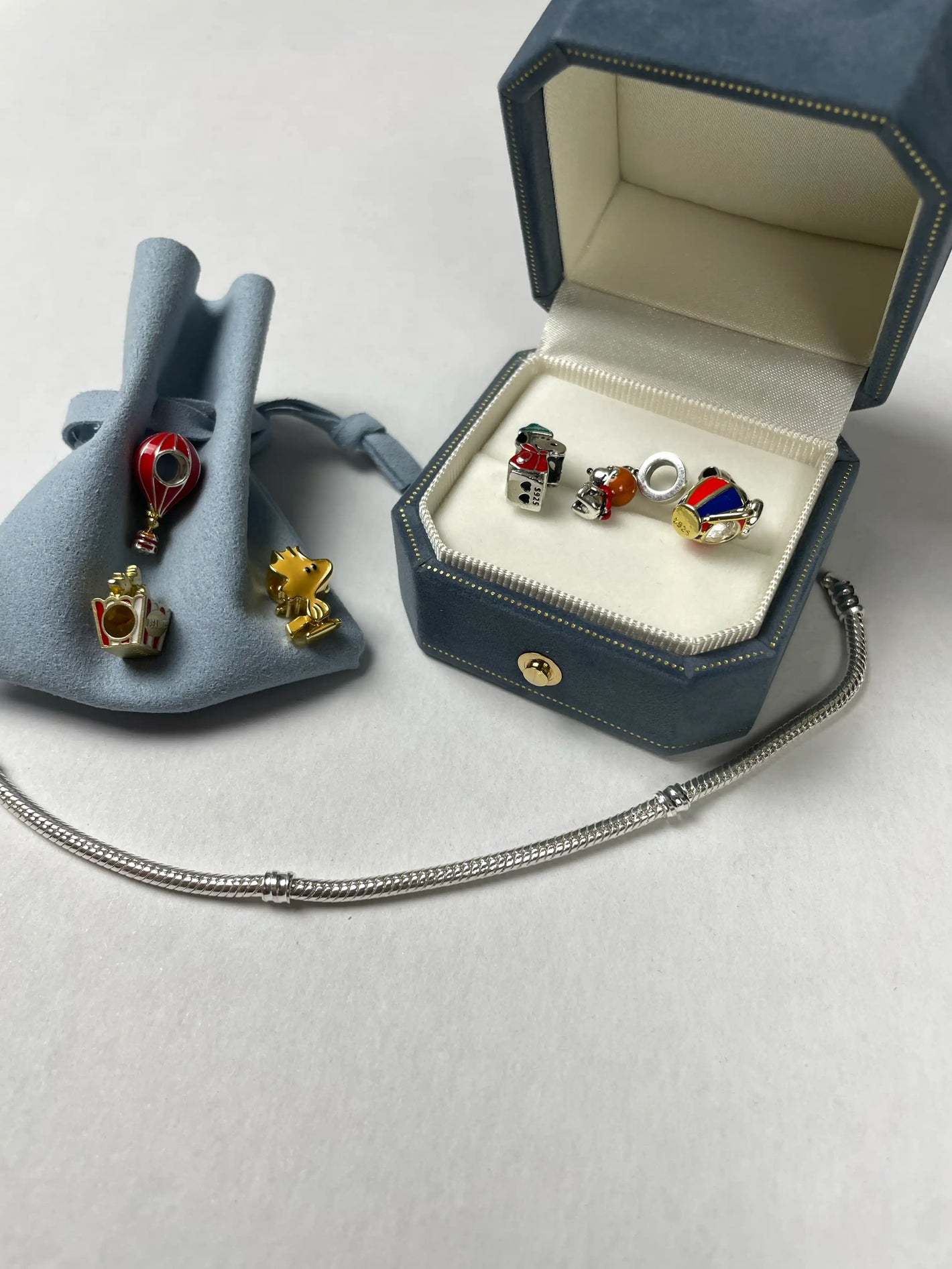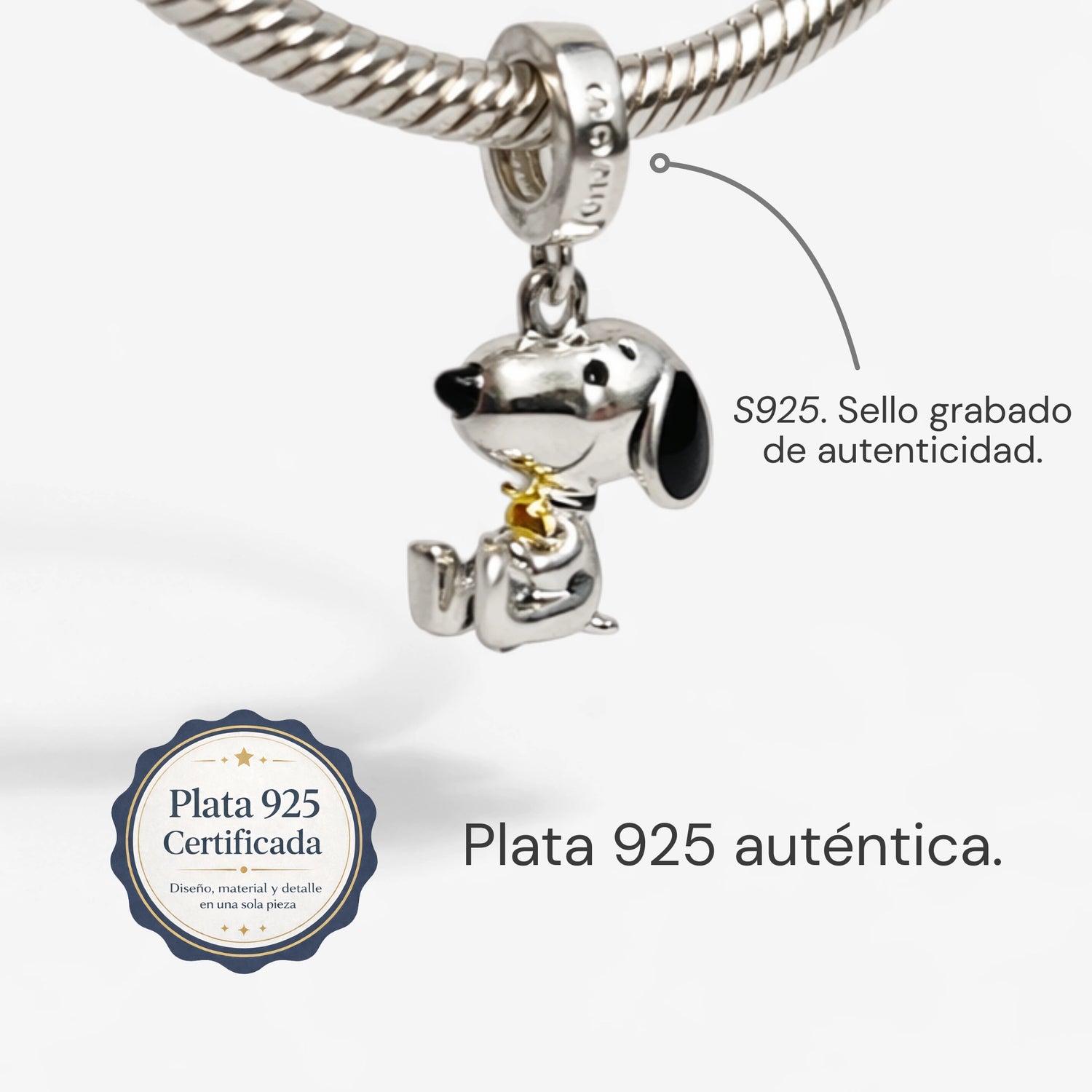 Nuestros charms y brazaletes están elaborados en plata de ley 925, seleccionada por su durabilidad y brillo.